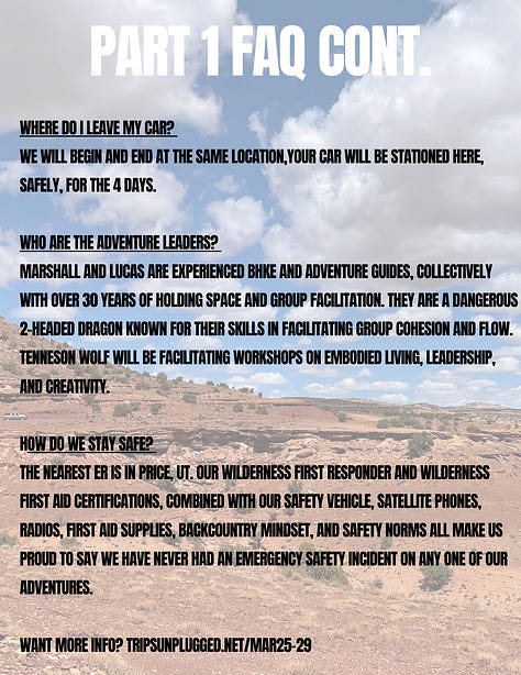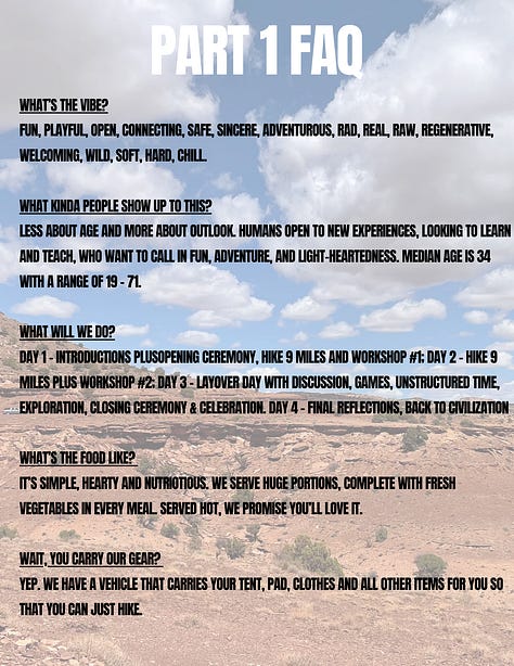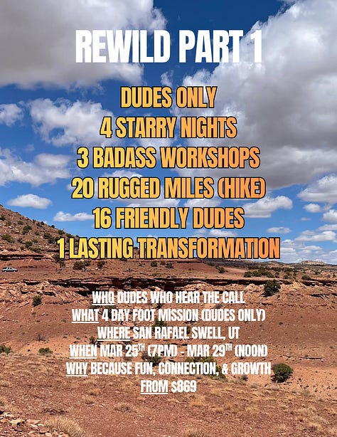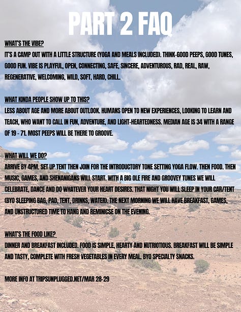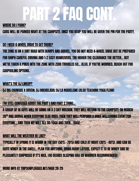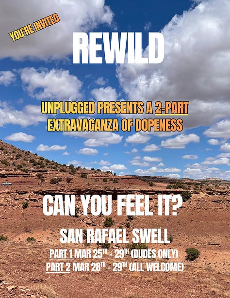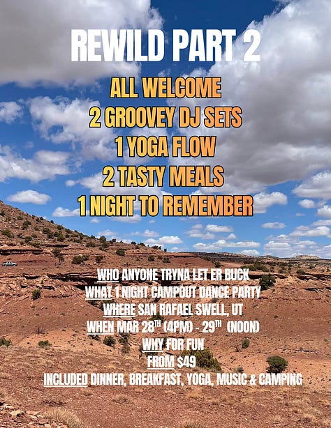 Part 1 is March 25th-28th in the San Rafael Swell, 3 days of this, plus workshops and adventure (dudes only for part 1). Part 2 is March 28th-29th in the San Rafael Swell (same spot), and it’s not dudes only, it’s for everyone. Located at the same camp zone and piggy backs on the tail end of the dudes adventure— it’s a one night camp out dance party for all. It’s what I described in the writing above.