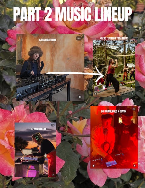 You’re nervousness dissipates upon having a safe, private, comfy sleep zone for reprieve if you so need. Groovy melodic, chill tunes are being laced by Madeline, the yoga teacher and DJ. She kindly gives you a ten minute warning to find a spot for your mat. “I’ve got you from here” she says.